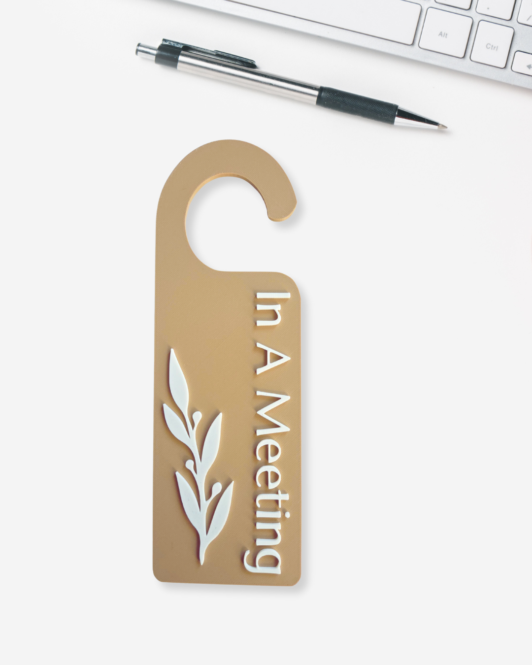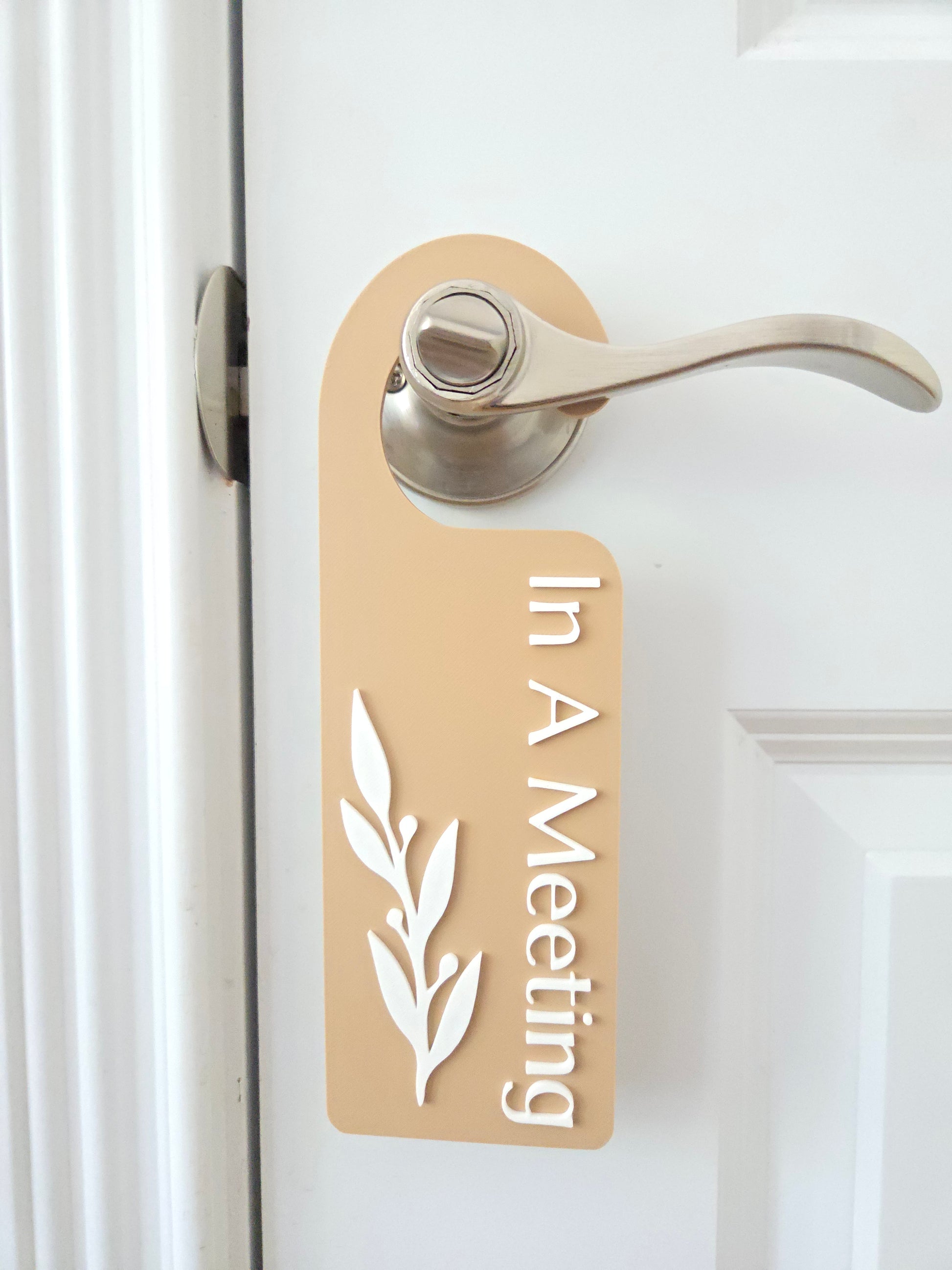 Ensure privacy anEnsure privacy and minimize distractions with this "Meeting in Progress" door hanger. Designed for offices, conference rooms, home workspaces, and therapy sessions, this stylish and functional sign clearly communicates that a meeting is underway. The pink background with an elegant white leaf design adds a professional and modern touch to any workspace.