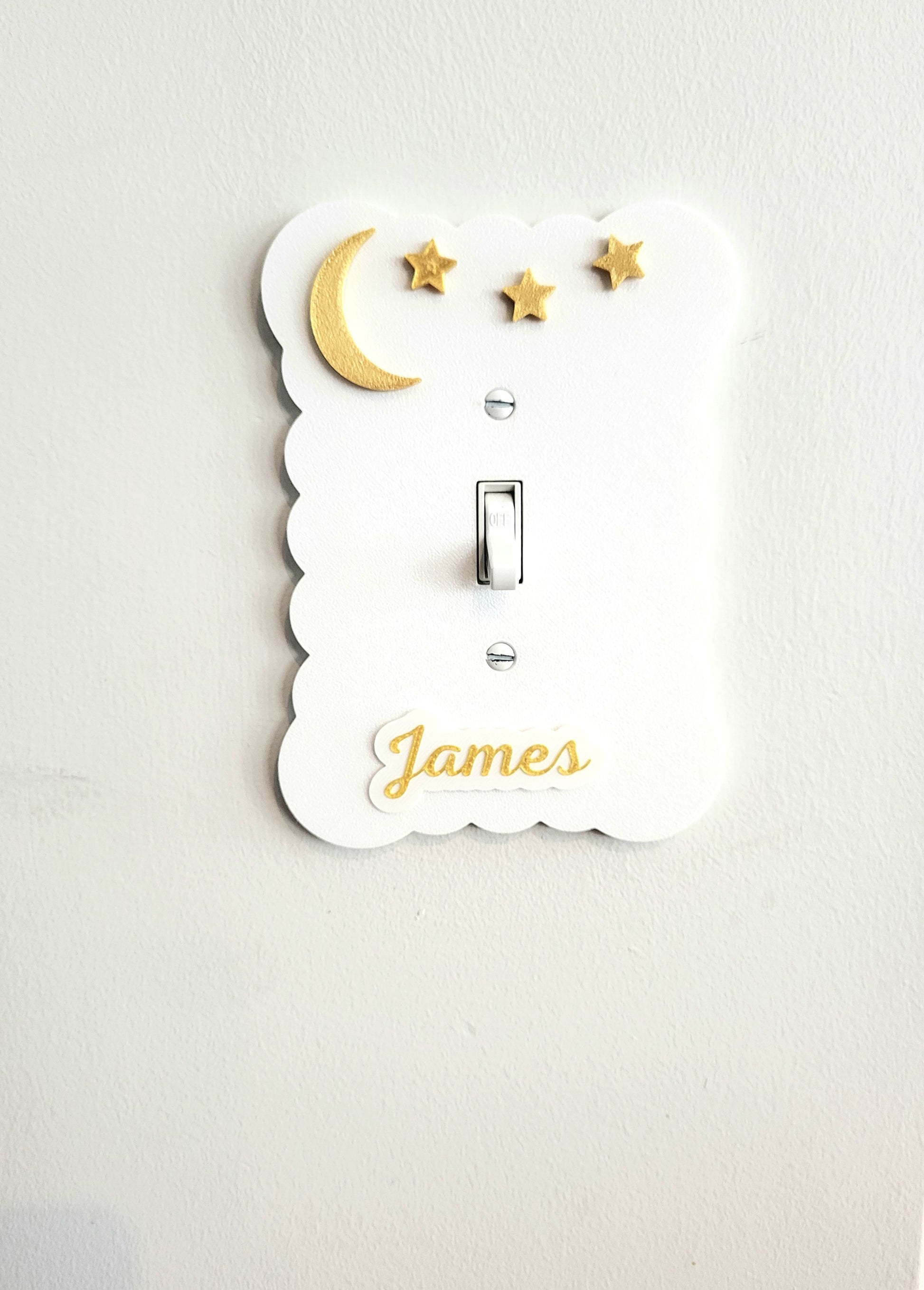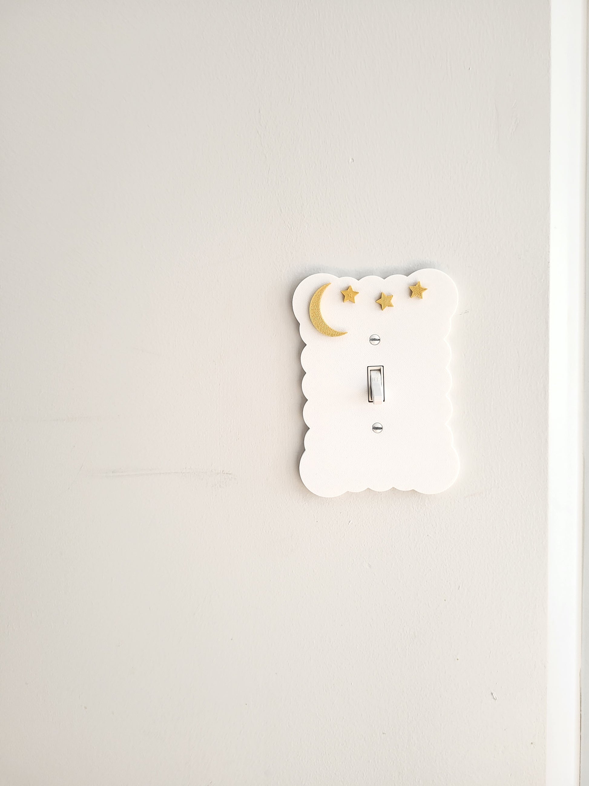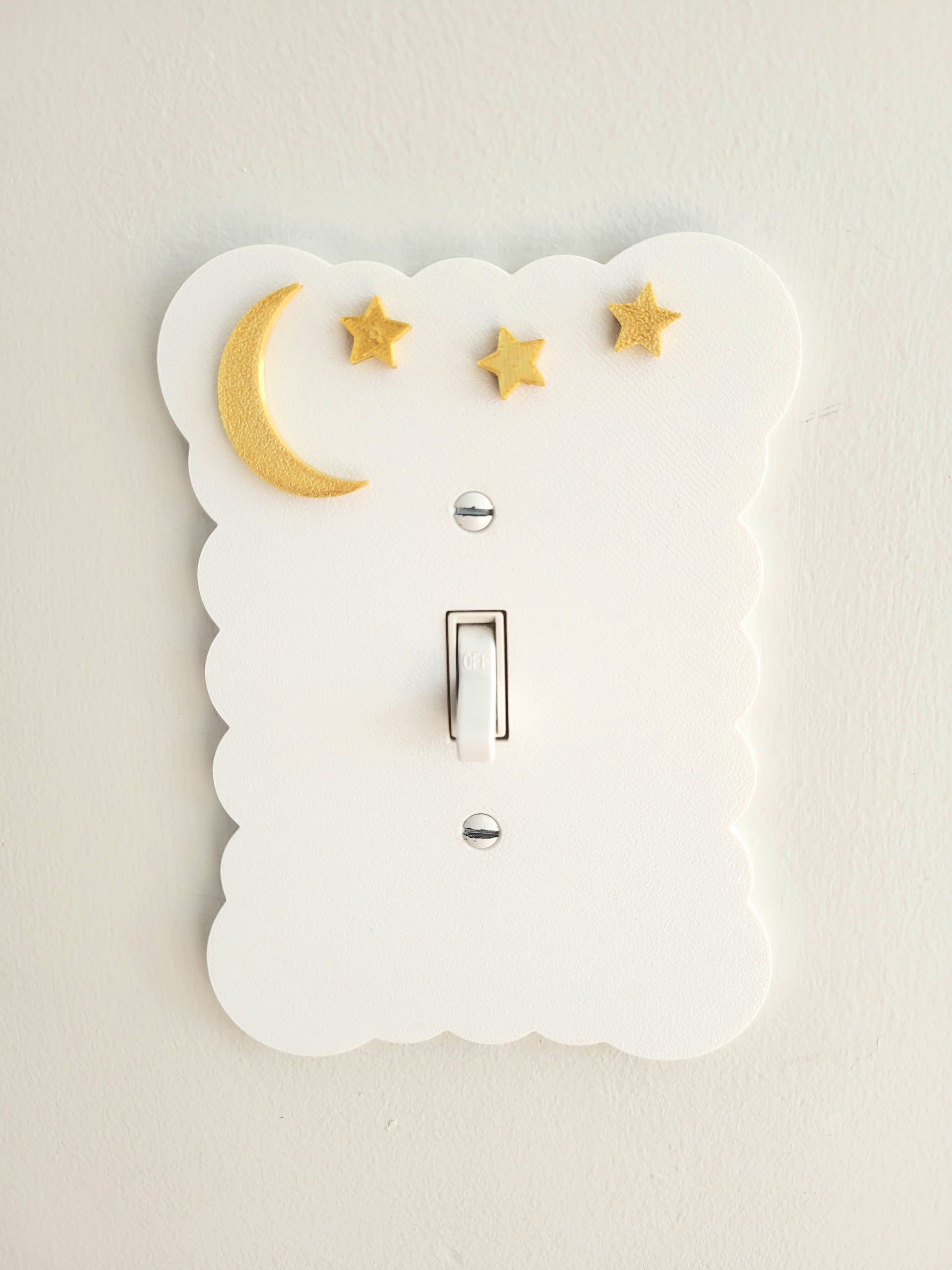 Bring a dreamy, celestial vibe to your walls with this moon and stars-themed light switch cover! Featuring a scalloped edge design with elegant gold moon and star accents, this switch plate is perfect for nurseries, kids' rooms, or anyone who loves starry, whimsical decor. Designed to fit standard toggle and rocker light switches, this durable and lightweight cover installs easily using your existing screws.
