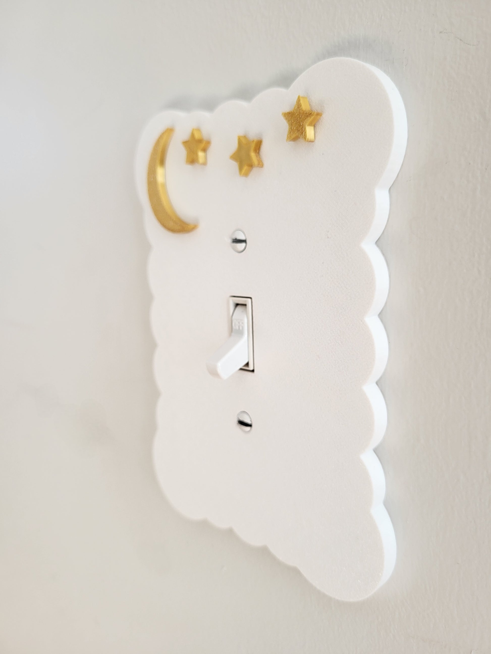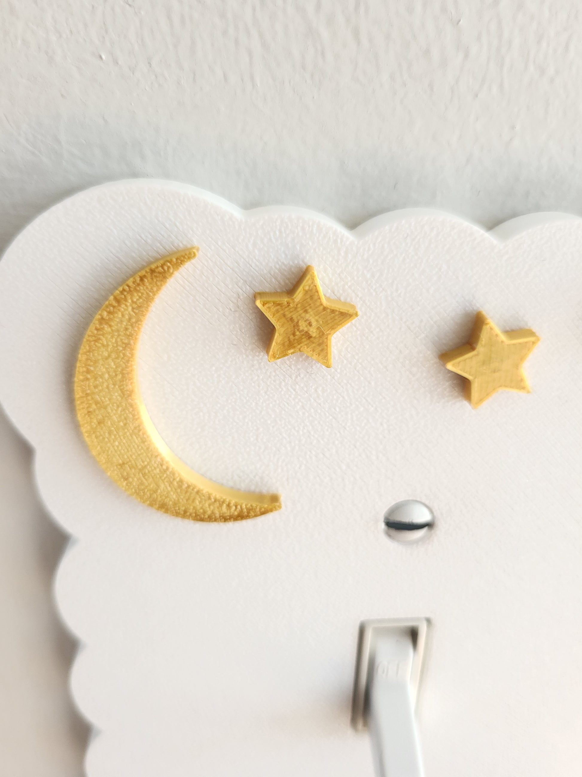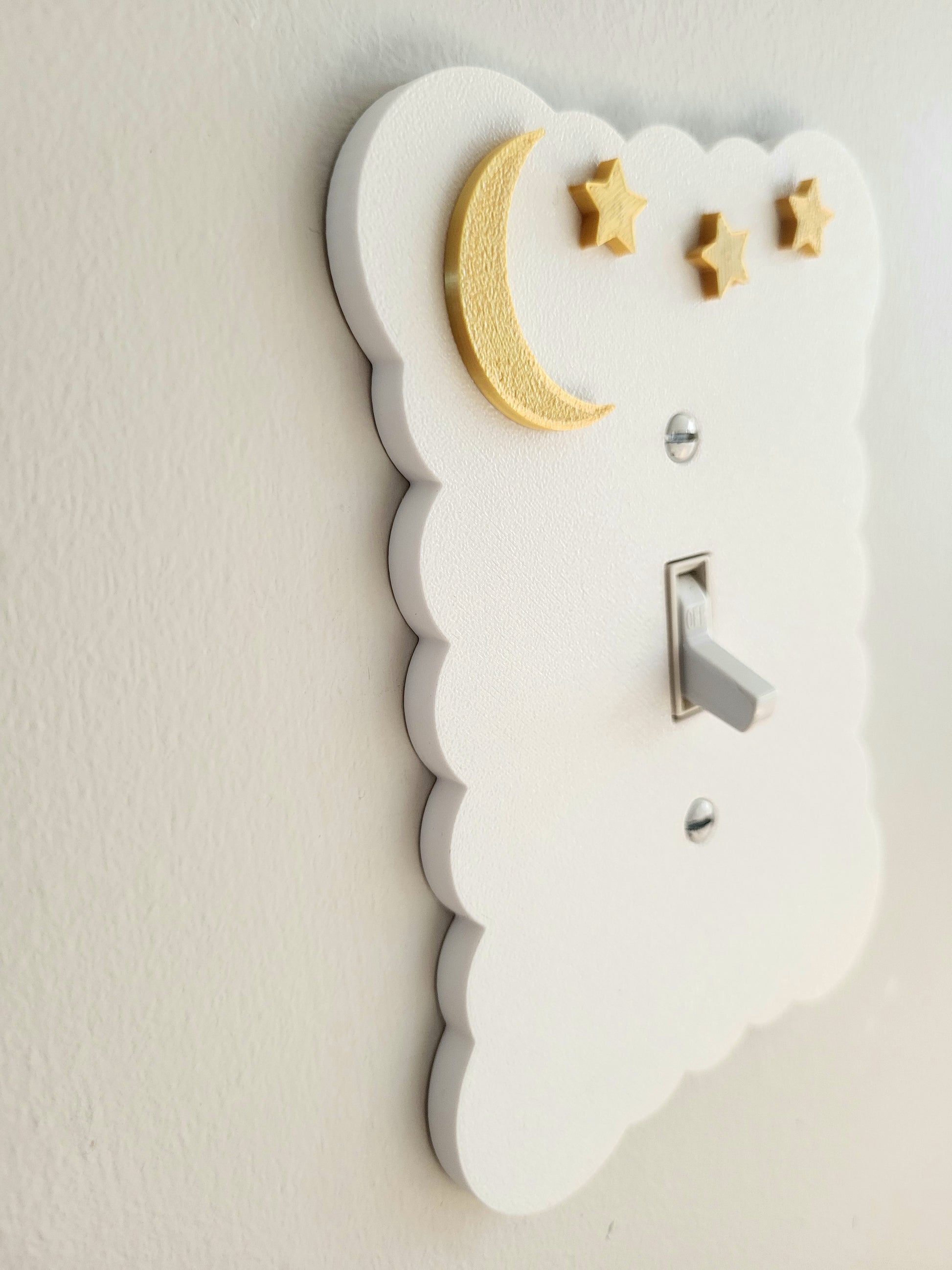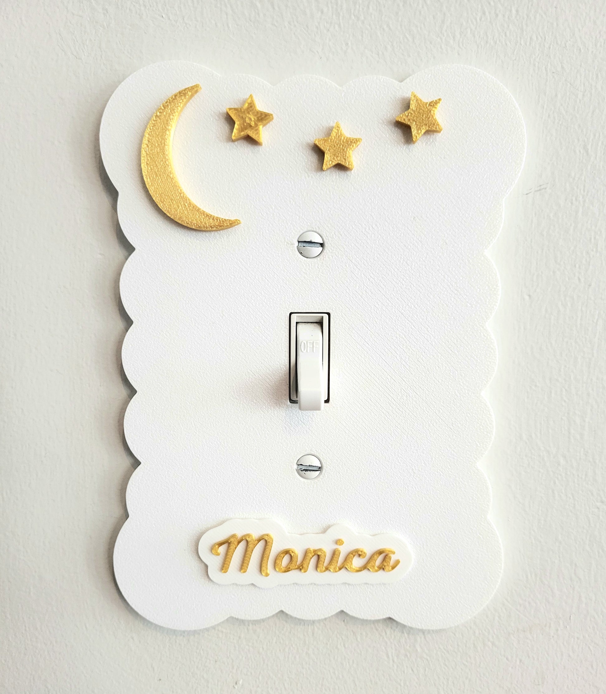 Bring a dreamy, celestial vibe to your walls with this moon and stars-themed light switch cover! Featuring a scalloped edge design with elegant gold moon and star accents, this switch plate is perfect for nurseries, kids' rooms, or anyone who loves starry, whimsical decor. Designed to fit standard toggle and rocker light switches, this durable and lightweight cover installs easily using your existing screws.