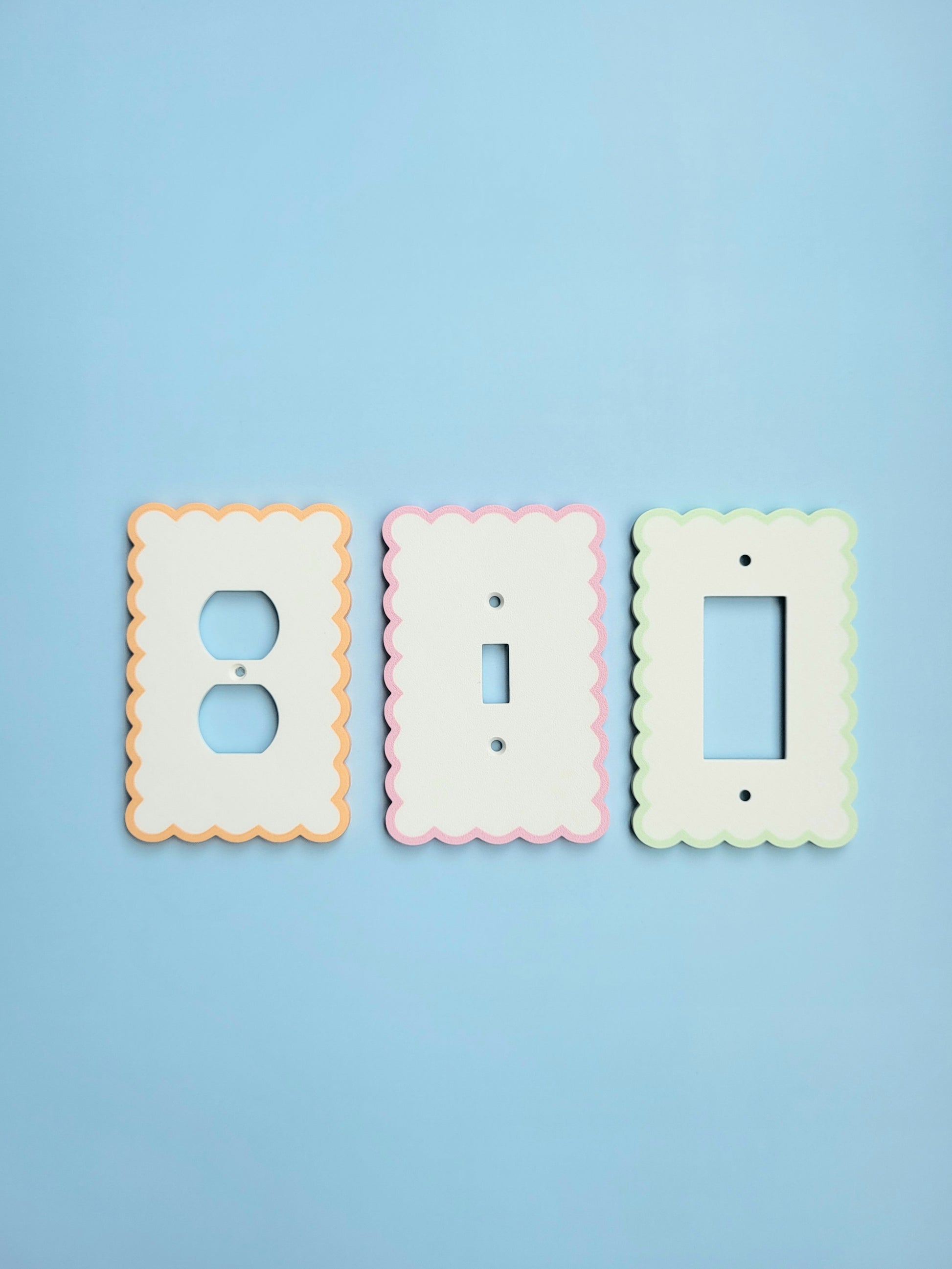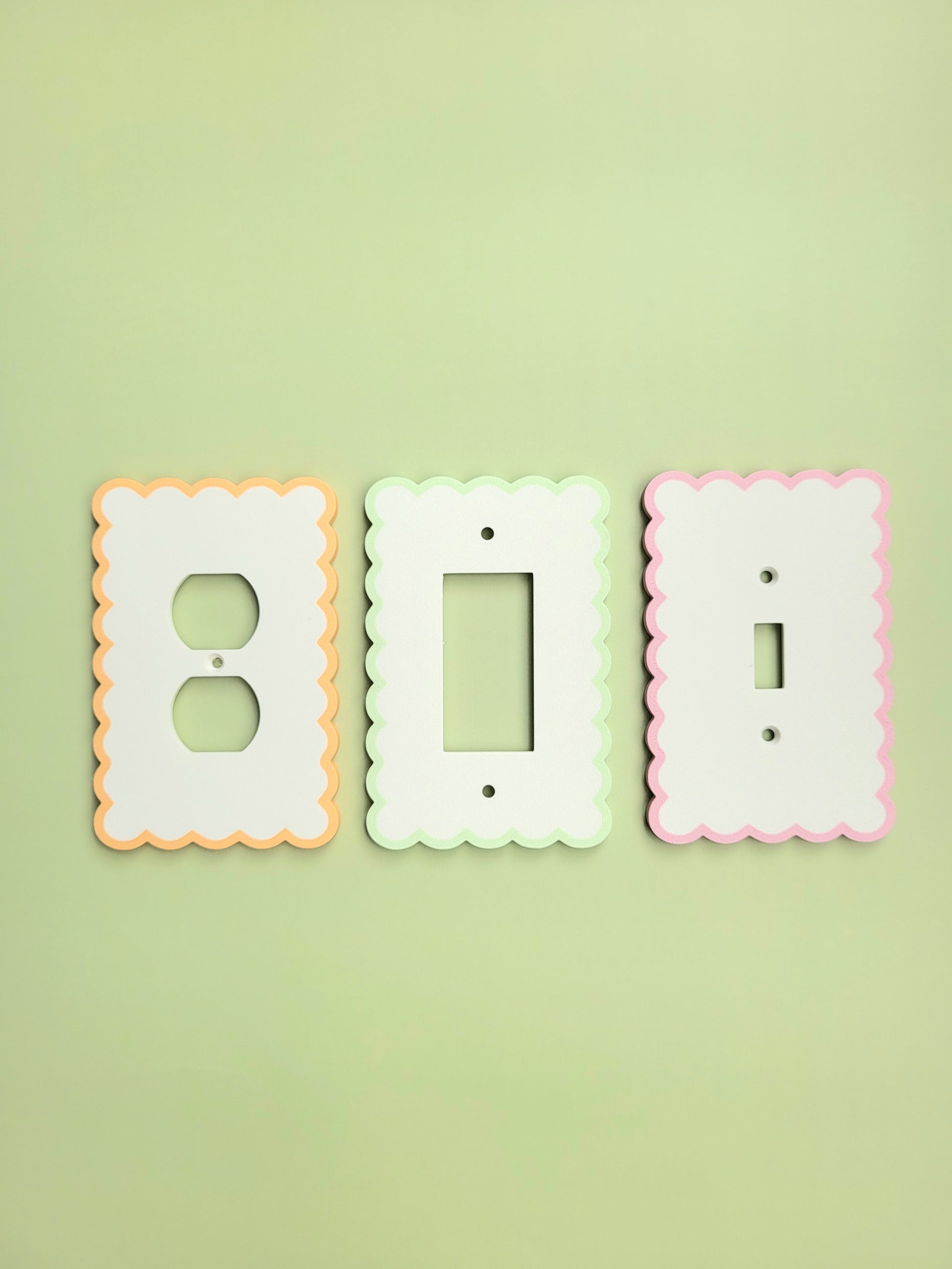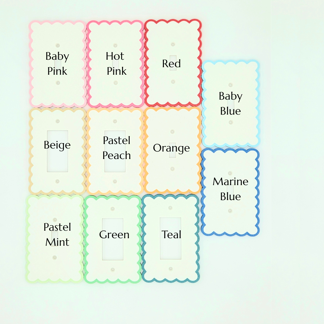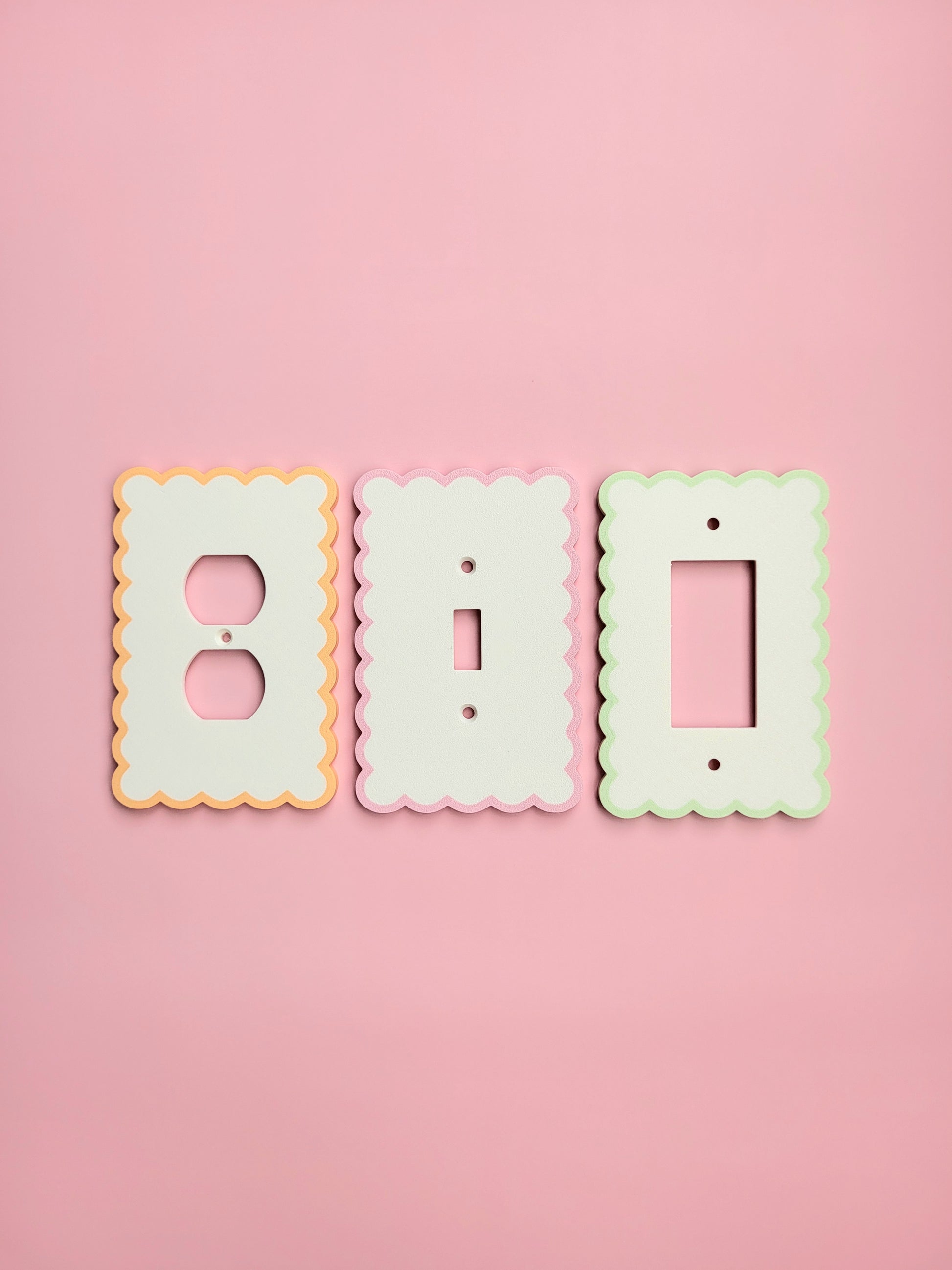 Each switch plate is finished with a unique scalloped trim and an eye-catching outer edge in a different color — a subtle but impactful way to brighten up any room. Choose from toggle, rocker, or outlet styles, and enjoy over 25+ color options to match your space perfectly.