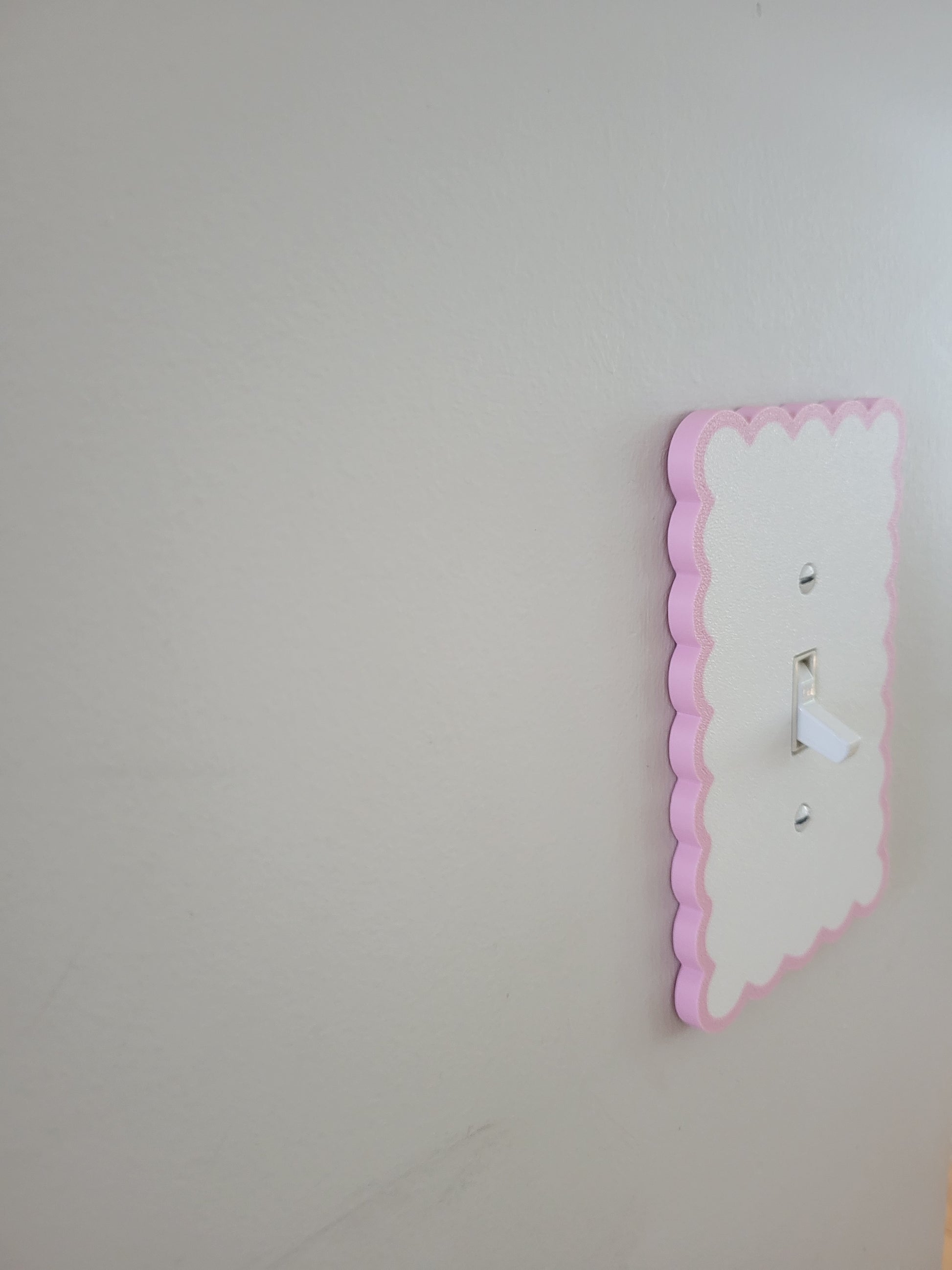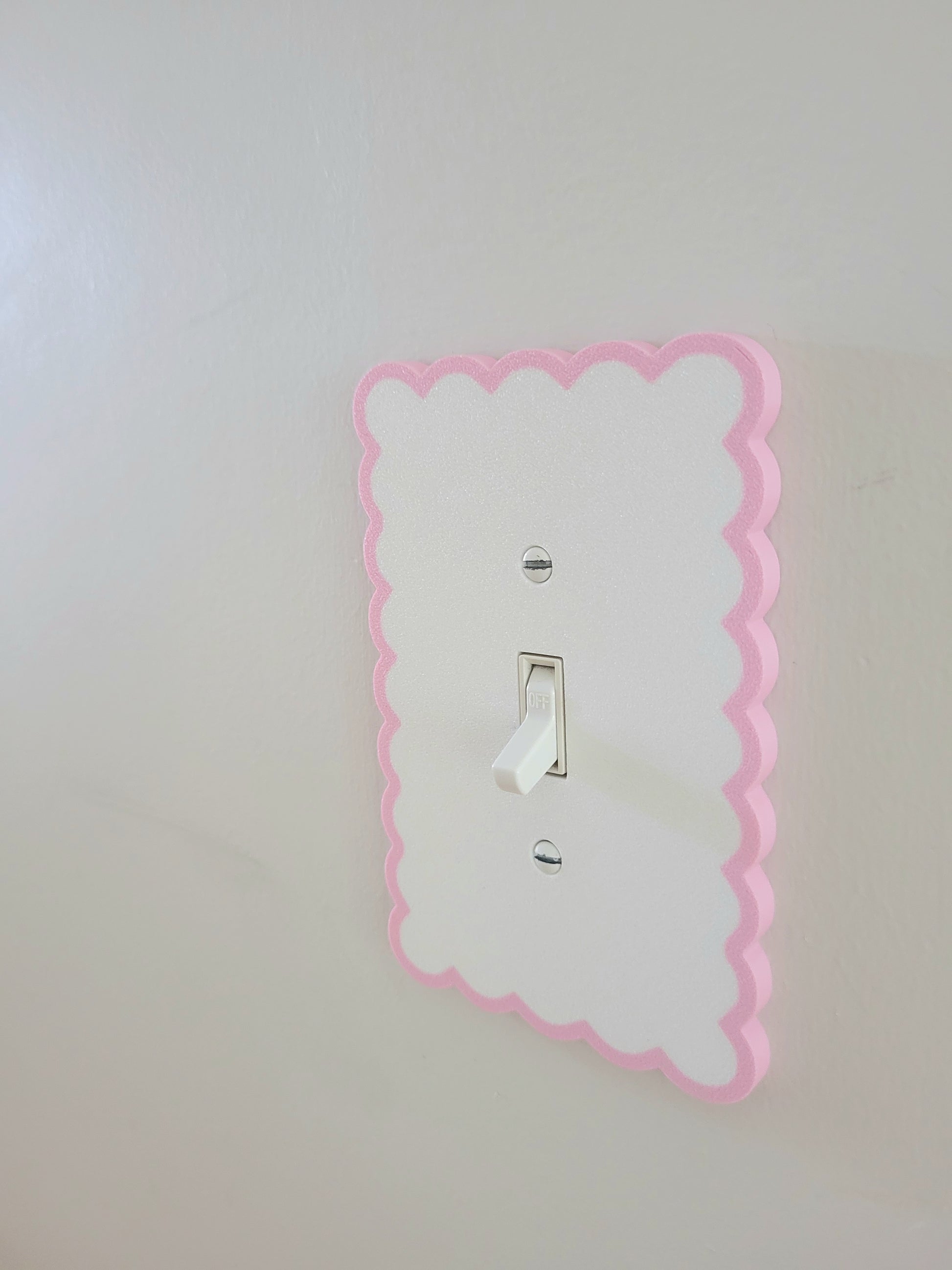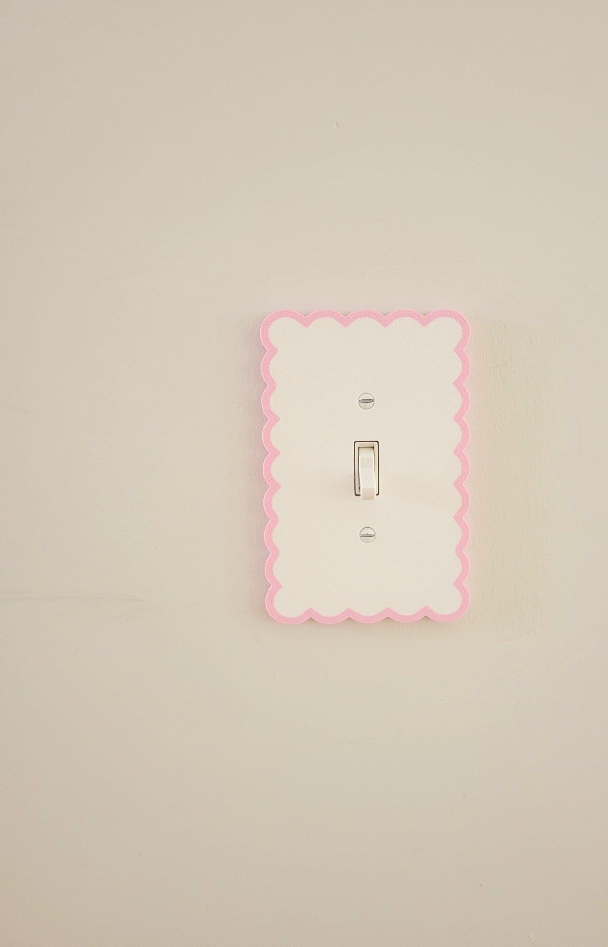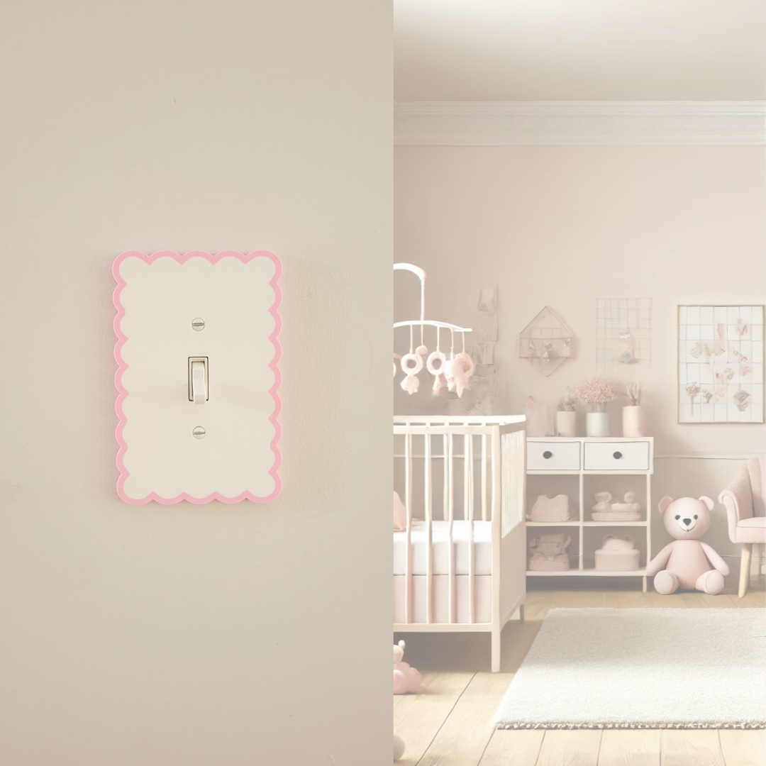 Add a sweet pop of color to your child’s space with this two-tone scalloped light switch cover, featuring a soft white face and playful contrasting pastel edge. Perfect for nurseries, baby rooms, kids’ bedrooms, or thoughtful baby shower gifts, this charming wall plate is both functional and decorative.